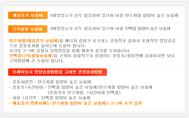 고탄수화물제품(체중증가보충제)는 운동전, 운동후 섭취하시면 운동시 필요한 영양이 충분히 섭취되어 운동수행능력향상과 함께 운동성과를 높이는데 도움이 됩니다