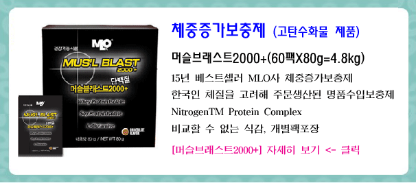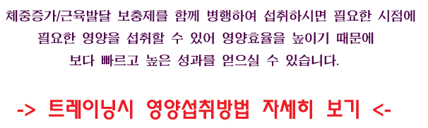 마른체형, 또는 벌크업을 희망하실 경우 위의 고탄수화물(체중증가보충제)과 함께 고단백질보충제(근육발달보충제)를 함께 섭취하시면 체중증가와 더불어 근육발달성과를 보다 높이는데 도움이 됩니다.